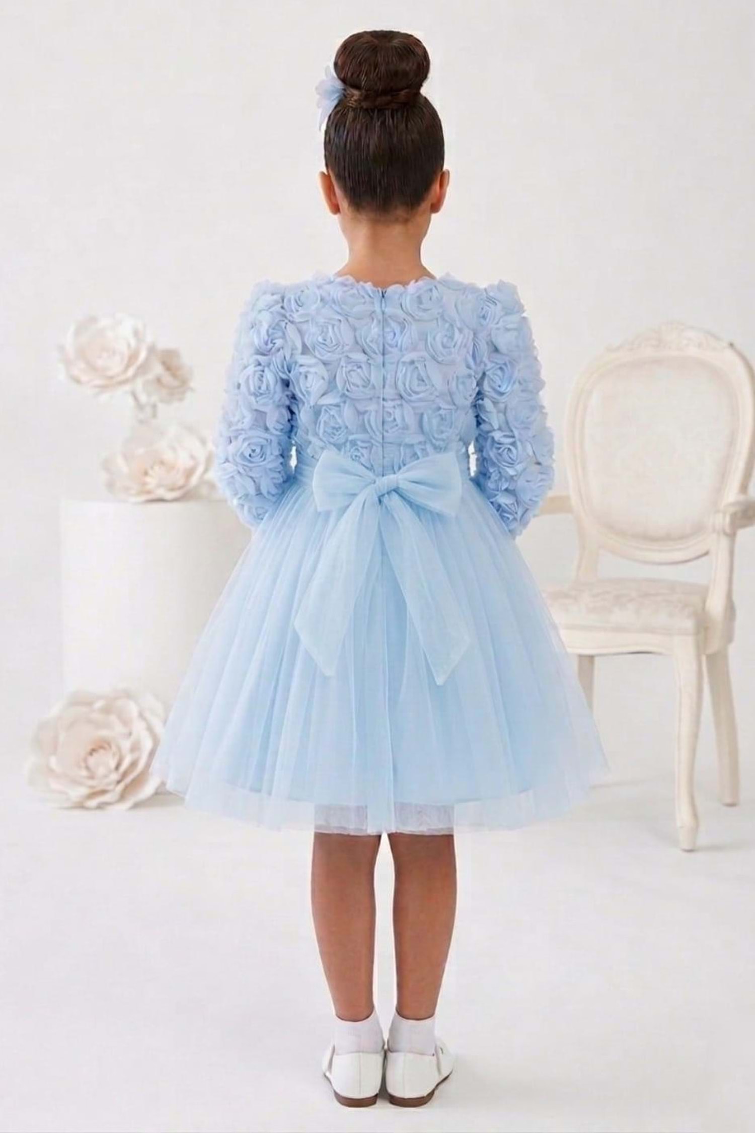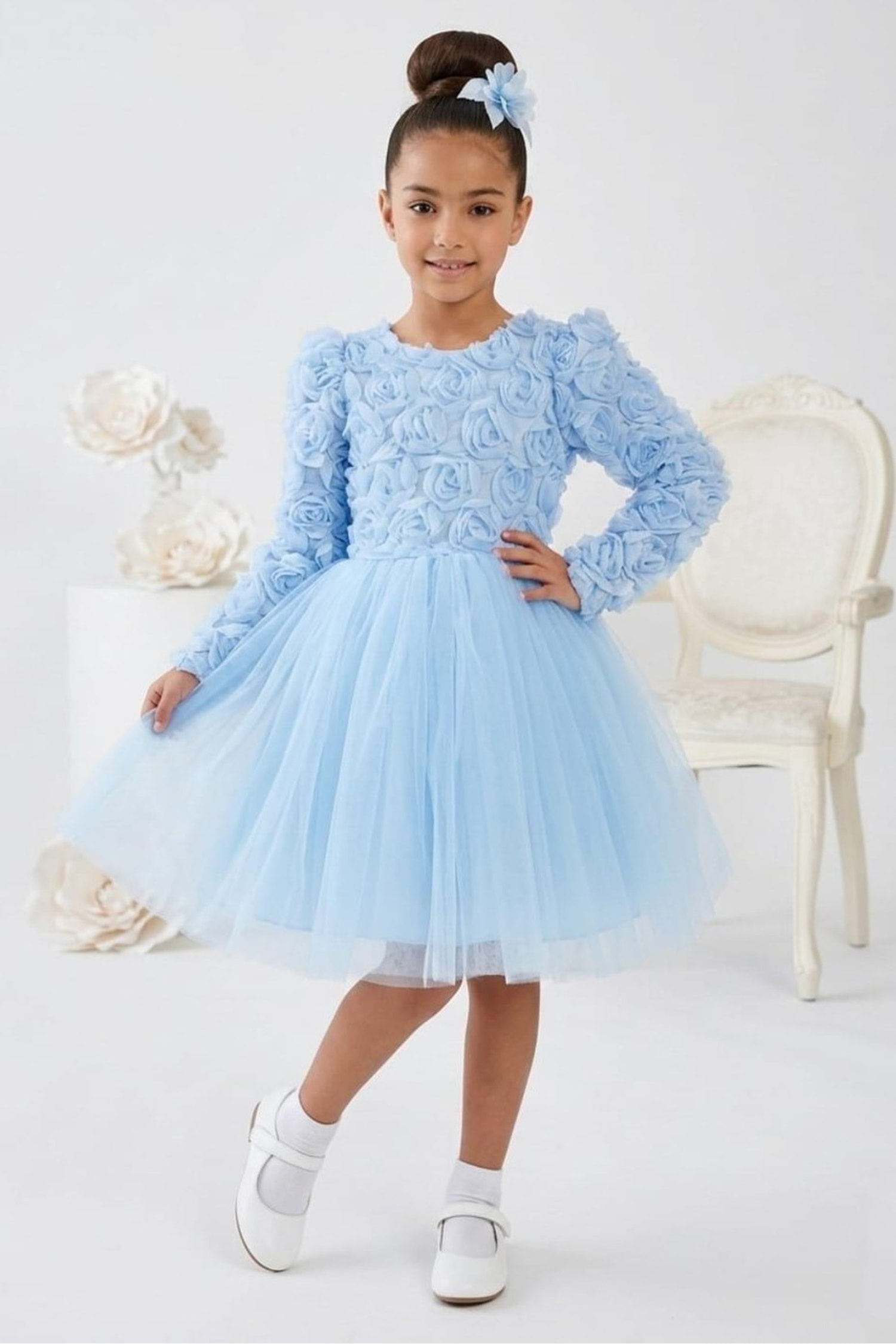 Kısa kollu tasarımı sayesinde yaz ve bahar organizasyonlarında rahatlıkla tercih edilir. Tütü formundaki kat kat tül eteği ve üzerine uygulanan gül detayları ile sahne ışığı gibi parlar. Çocuklar sever, anneler hayran kalır.