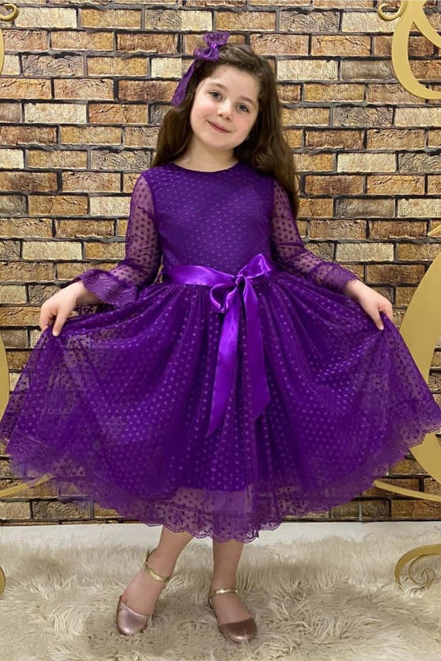 Mor Fransız Dantel Tokalı Kız Çocuk Elbise