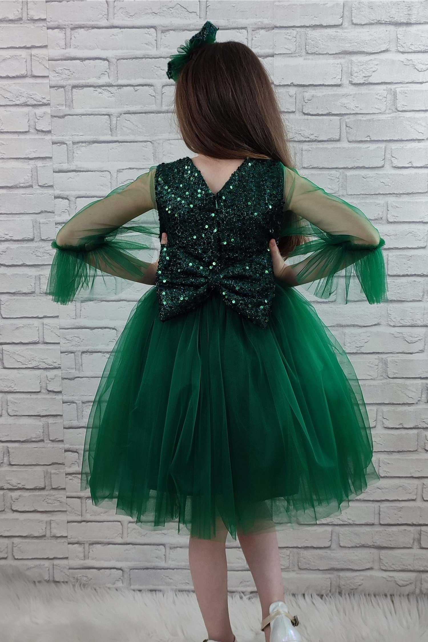 Saç tokası ile birlikte iki parçadan oluşan kız çocuk abiye elbise.