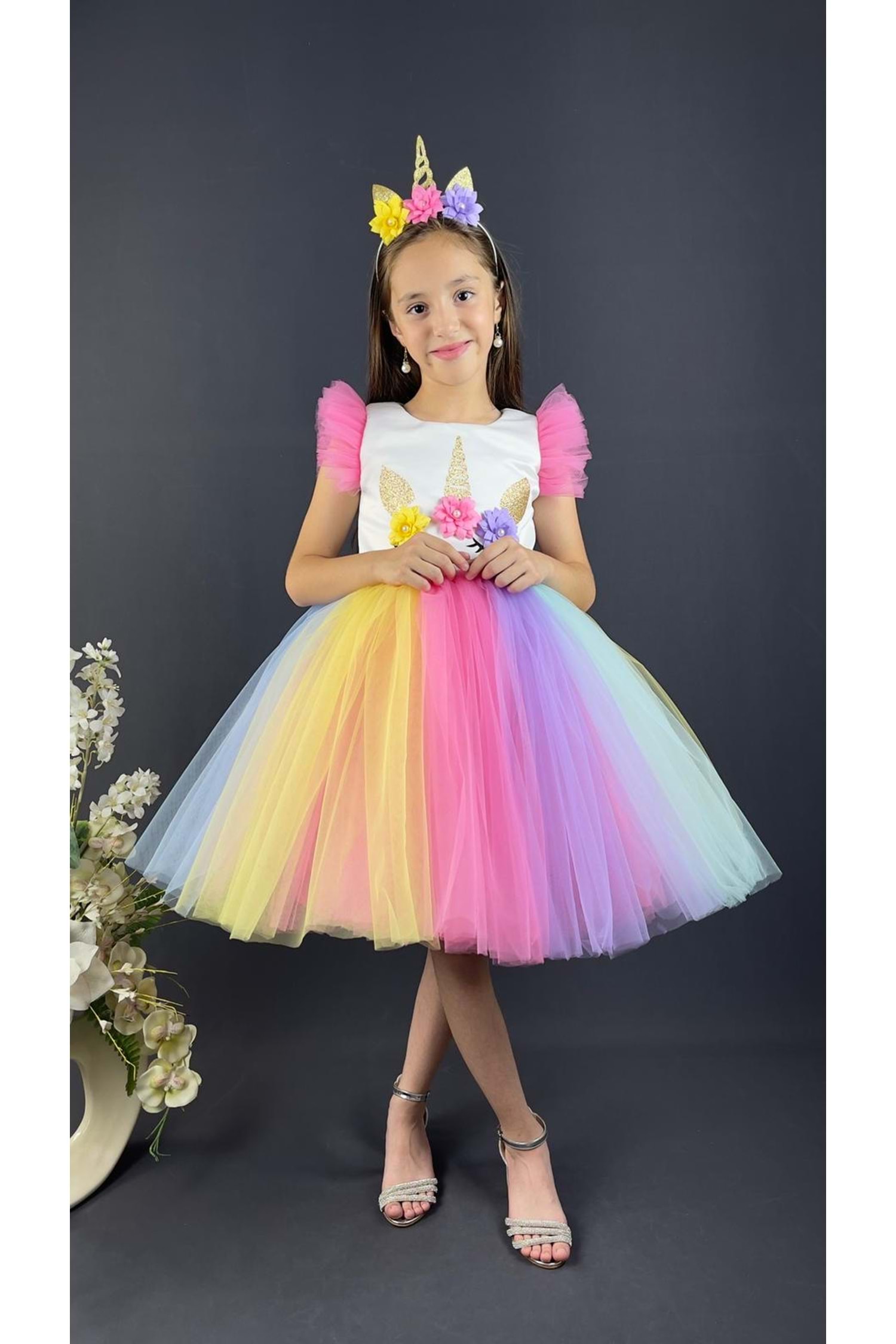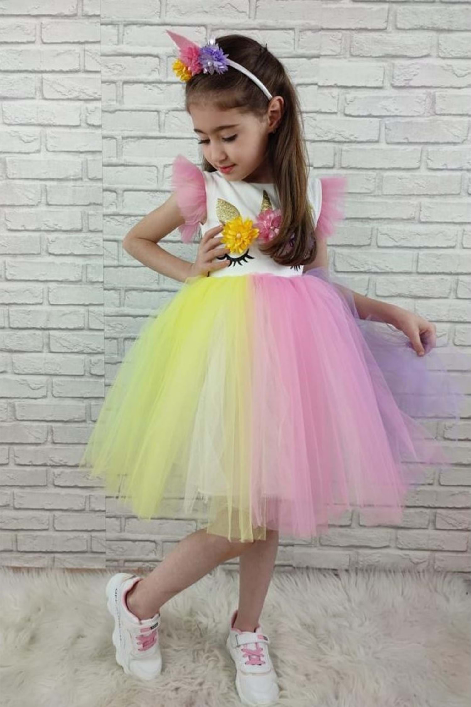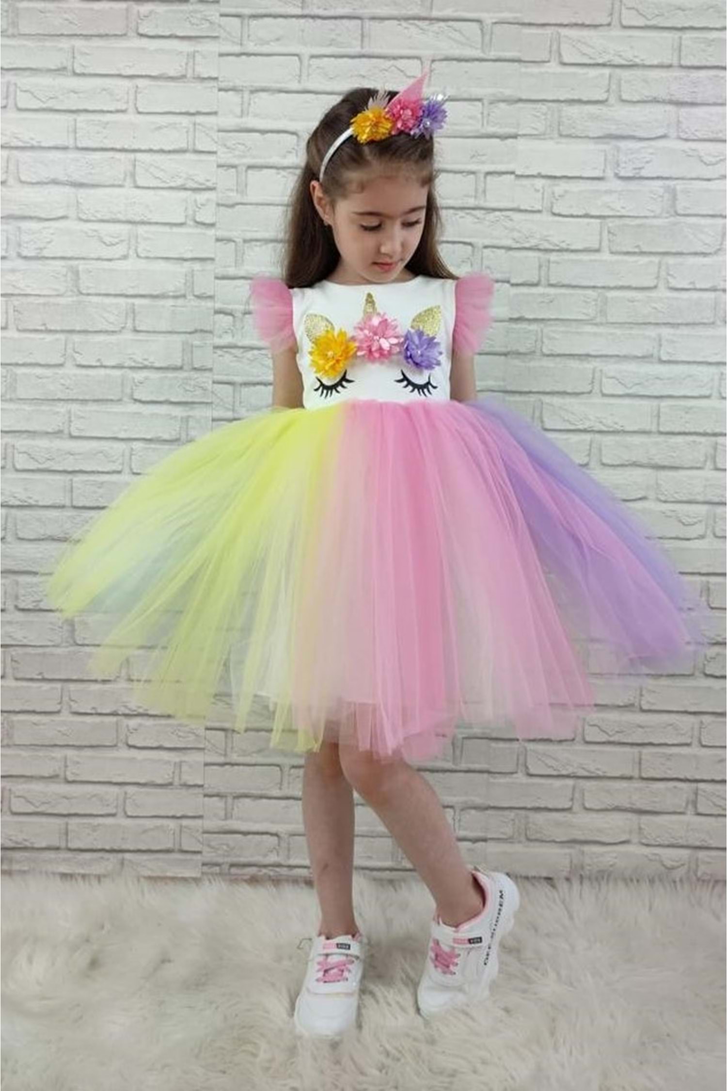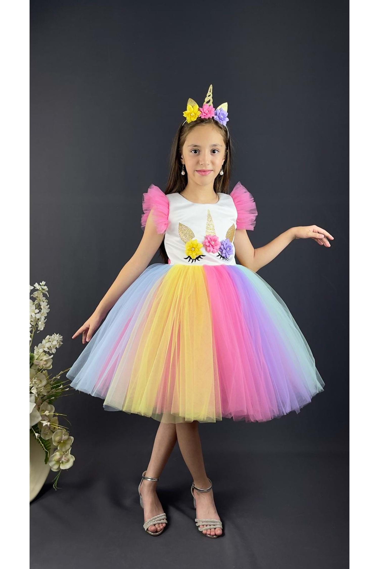 Rengarenk Saç Bantlı Kız Çocuk Parti Elbisesi – Pamuk Astarlı Prenses Elbise
