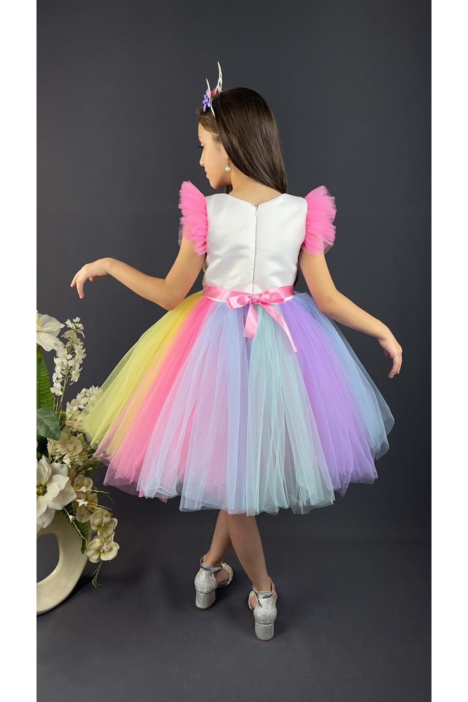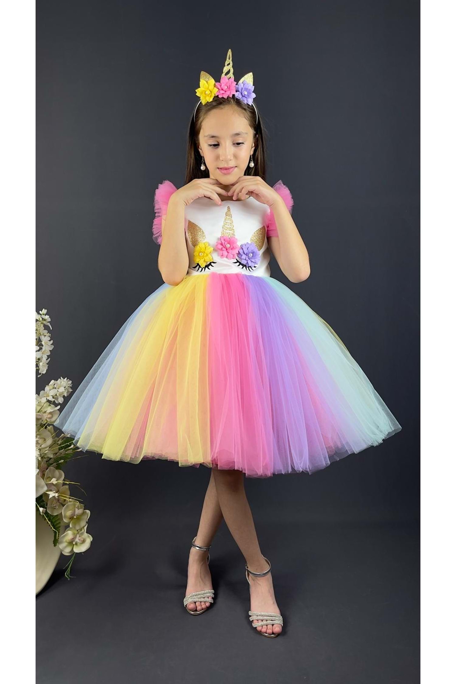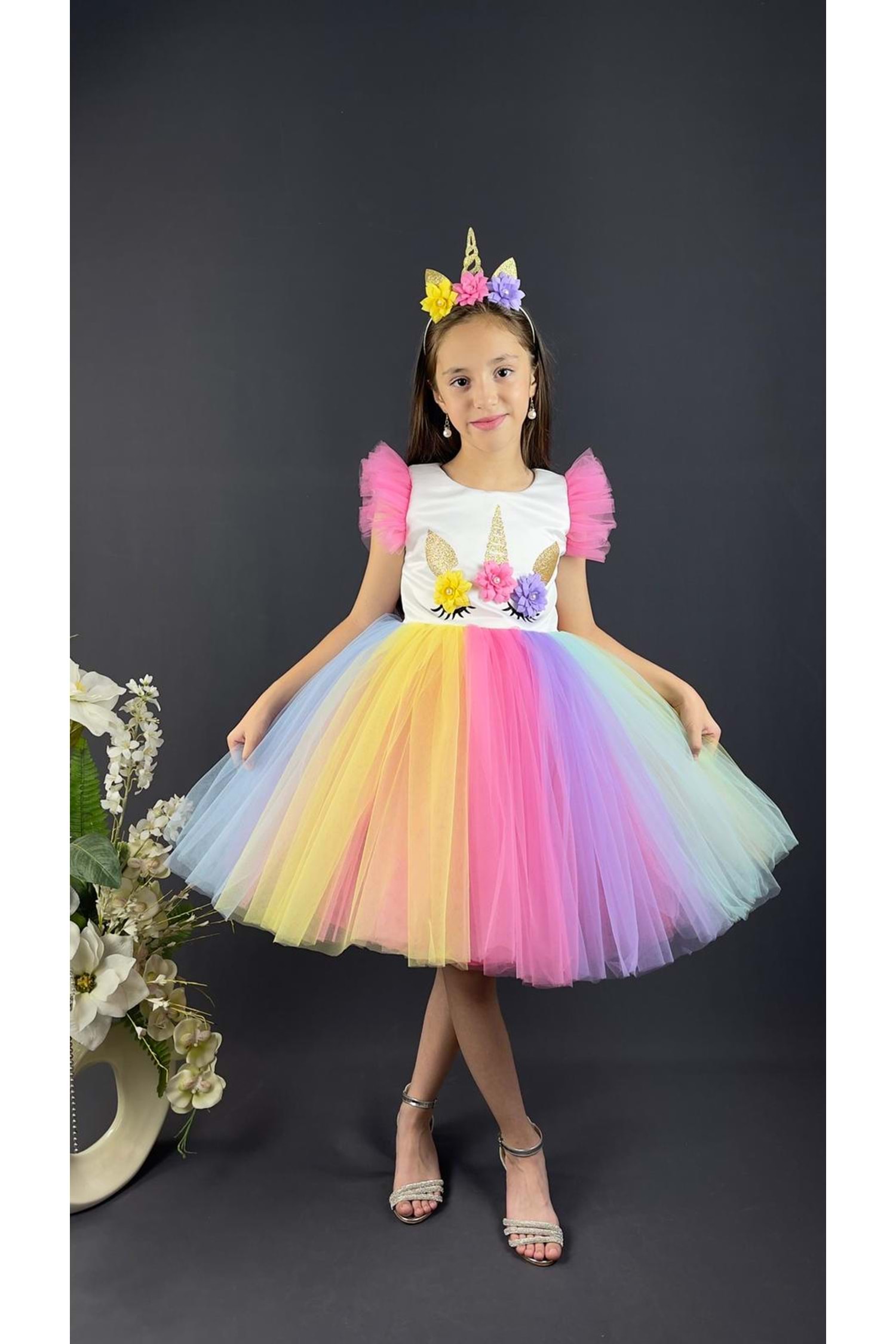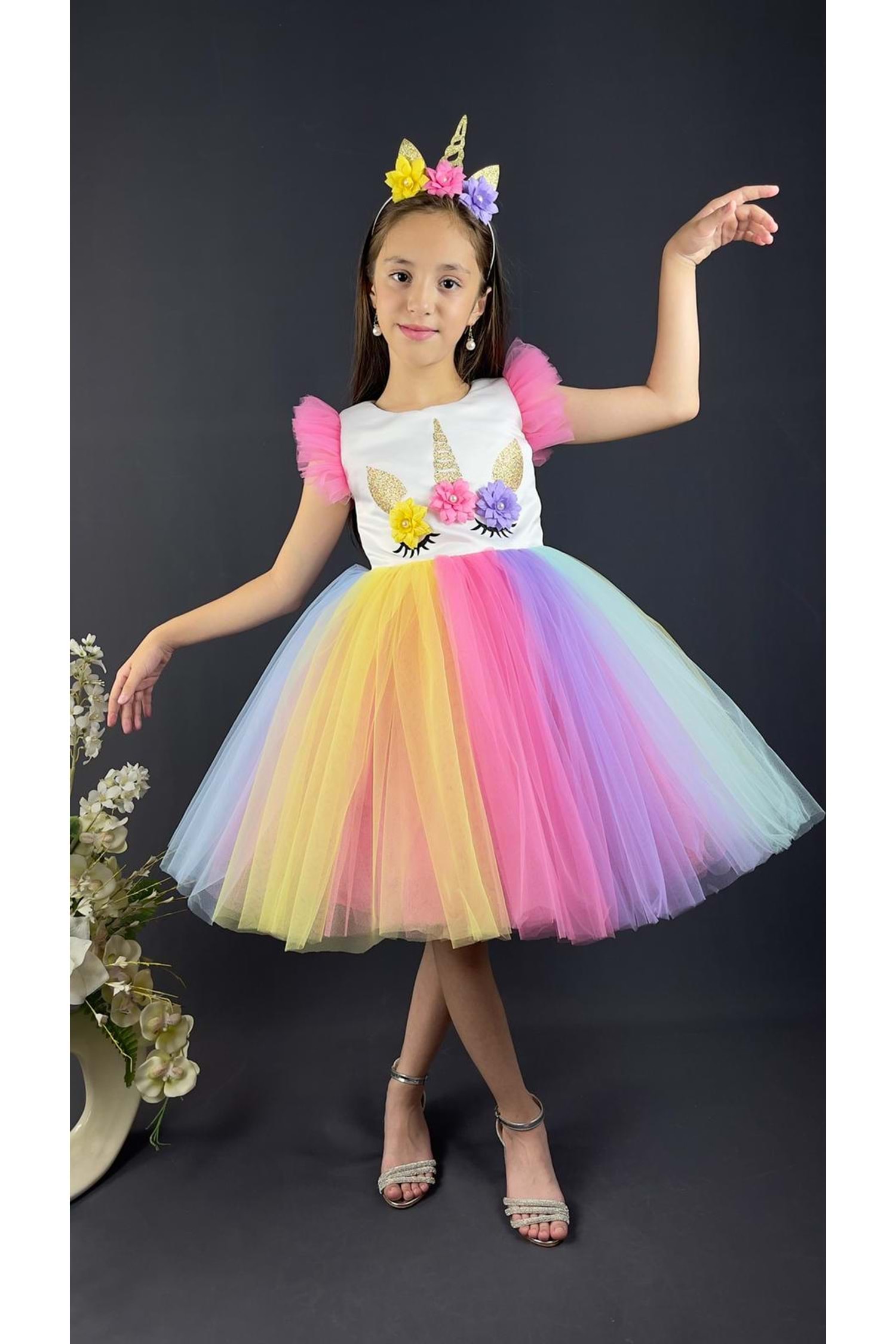 Rengarenk Saç Bantlı Kız Çocuk Parti Elbisesi – Pamuk Astarlı Prenses Elbise