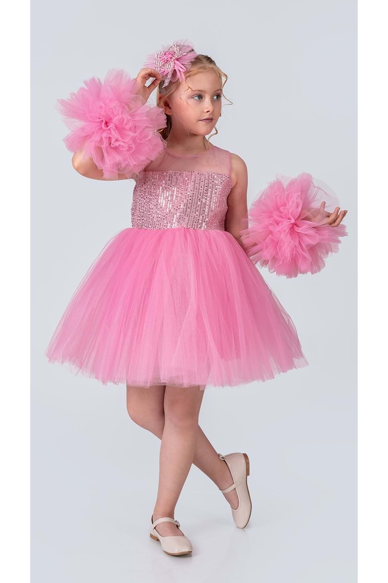 Şifon Robalı Ponpon Kol Pul Payetli Kız Çocuk Kabarık Etek Tütülü Abiye