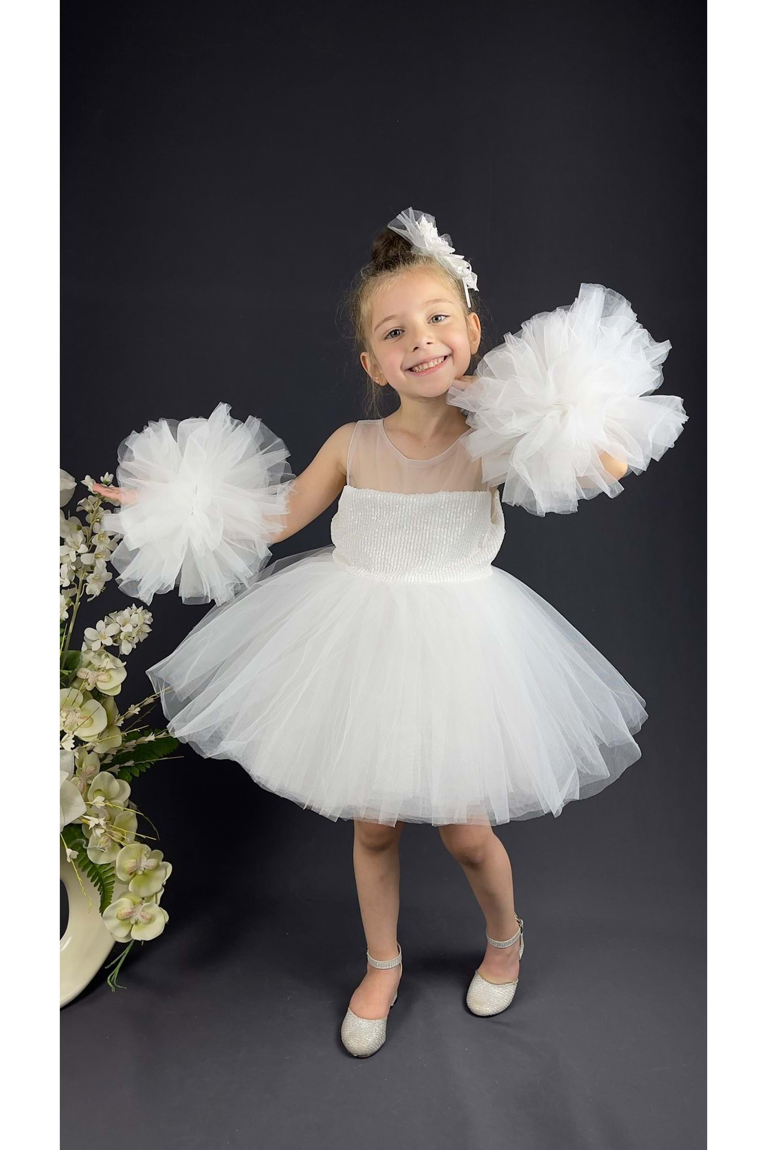 Şifon Robalı Ponpon Kol Pul Payetli Kız Çocuk Kabarık Etek Tütülü Abiye