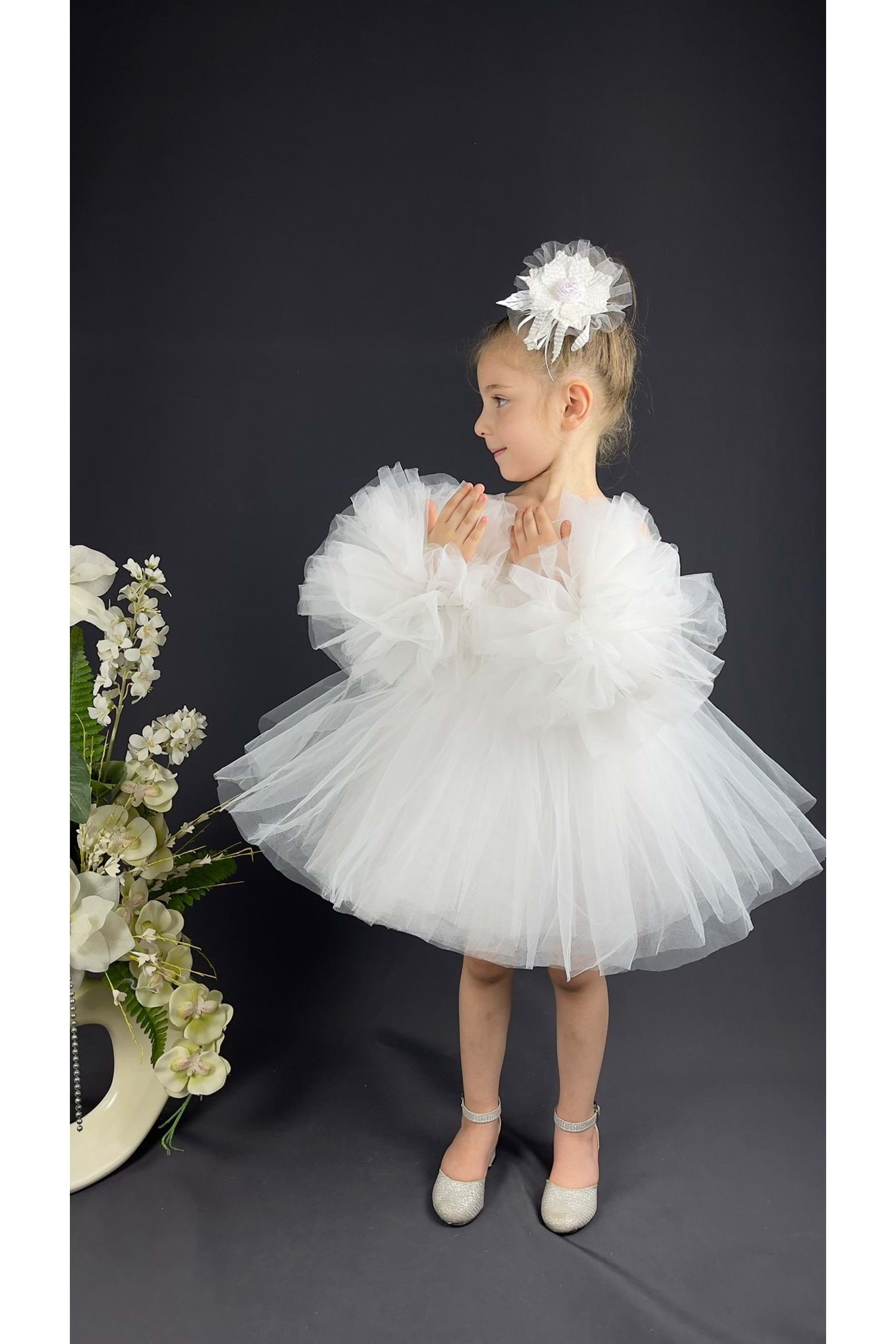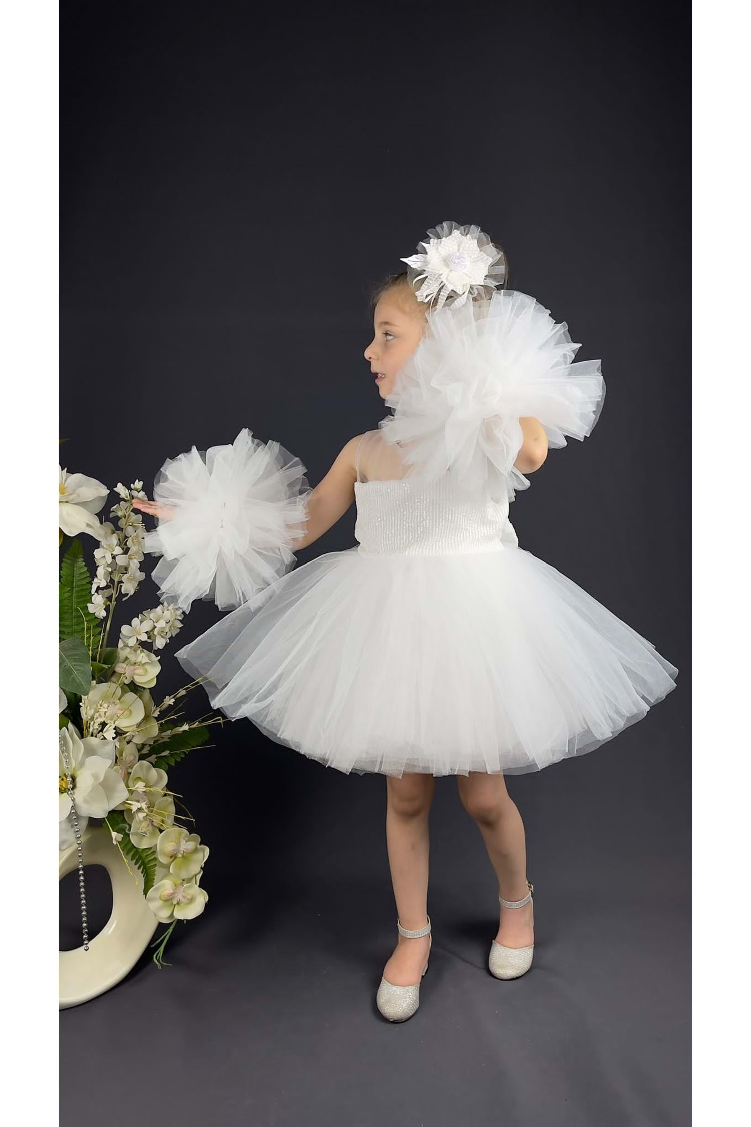 Masalsı Tasarım: Kabarık tütü eteği ve dikkat çekici ponpon kollarıyla bu abiye elbise, miniklerin adeta birer prenses gibi hissetmelerini sağlar. Her adımda zarafeti ve neşeyi yansıtır.