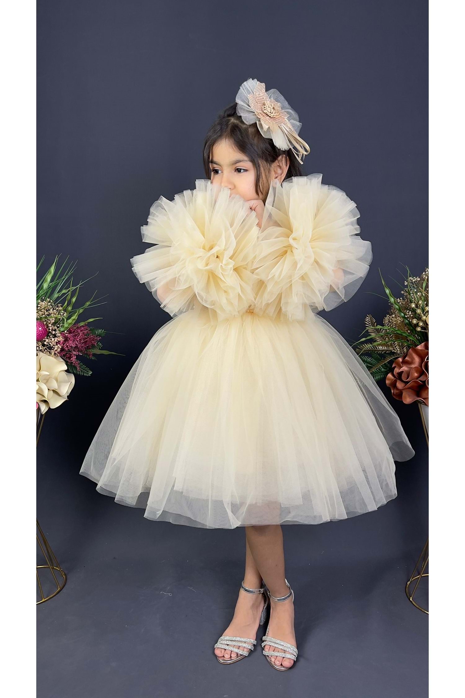 Masalsı Tasarım: Kabarık tütü eteği ve dikkat çekici ponpon kollarıyla bu abiye elbise, miniklerin adeta birer prenses gibi hissetmelerini sağlar. Her adımda zarafeti ve neşeyi yansıtır.