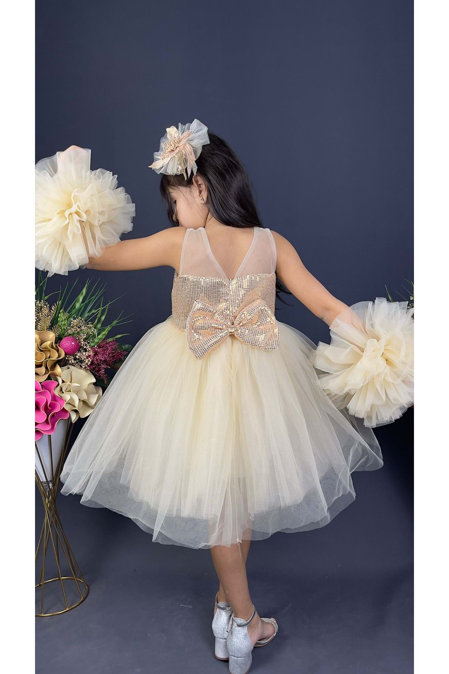 Şifon Robalı Ponpon Kol Pul Payetli Kız Çocuk Kabarık Etek Tütülü Abiye