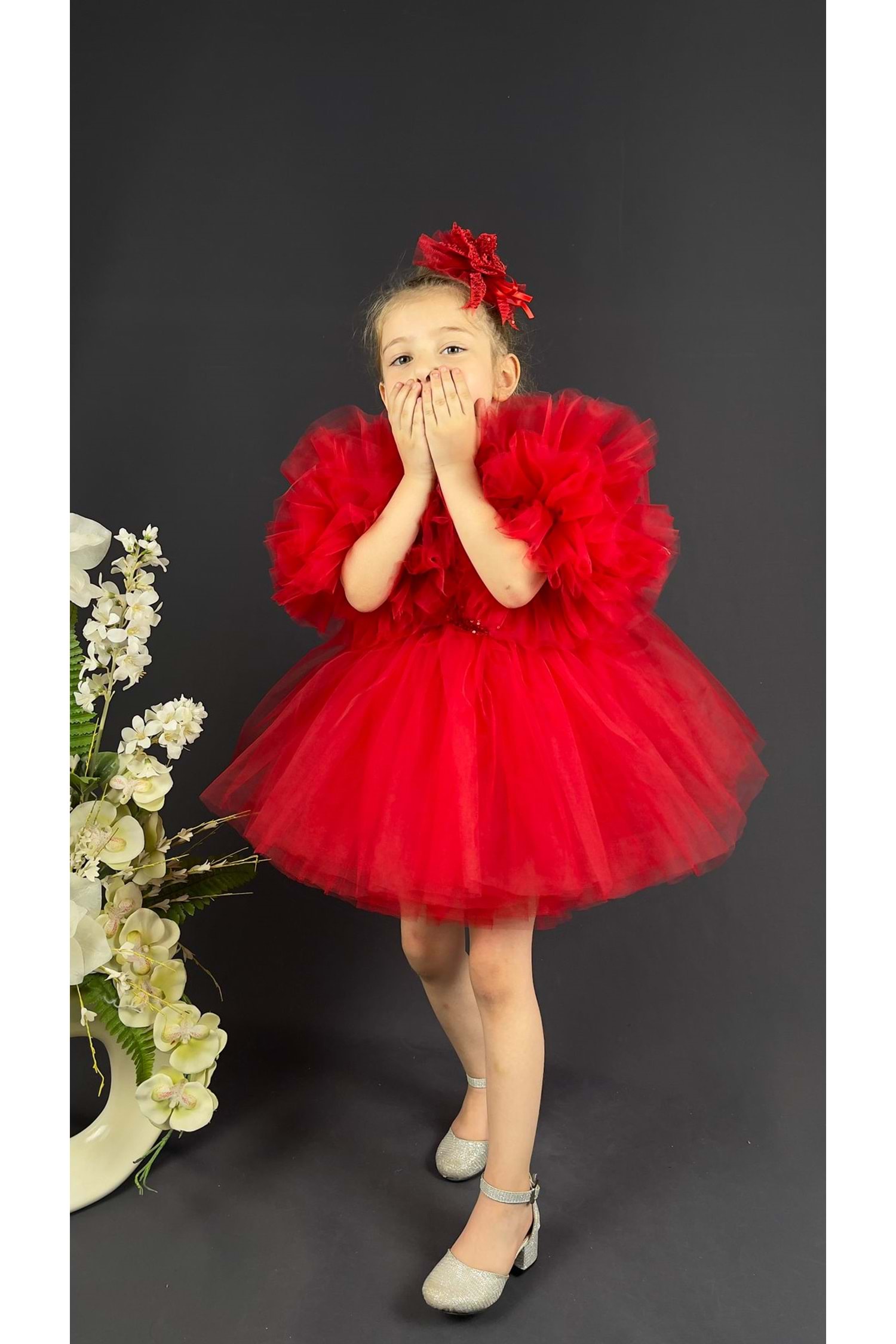 - Masalsı Tasarım: Kabarık tütü eteği ve dikkat çekici ponpon kollarıyla bu abiye elbise, miniklerin adeta birer prenses gibi hissetmelerini sağlar. Her adımda zarafeti ve neşeyi yansıtır.