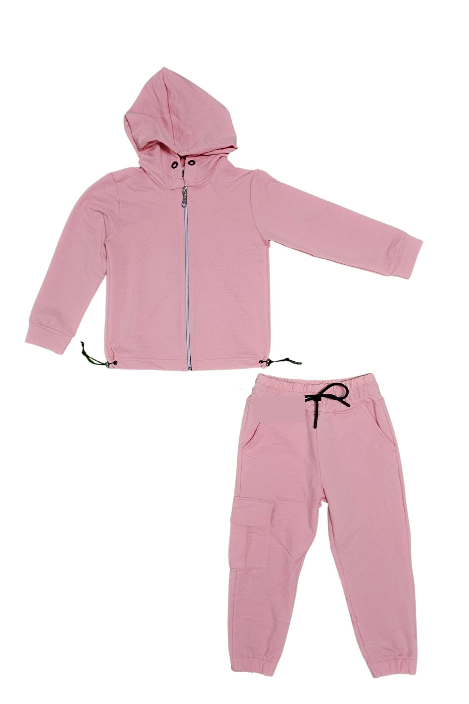 Kapşonlu Fermuarlı Beli Lastik Detaylı Kız Çocuk Günlük Eşofman Takımı 2 İplik MNK0664