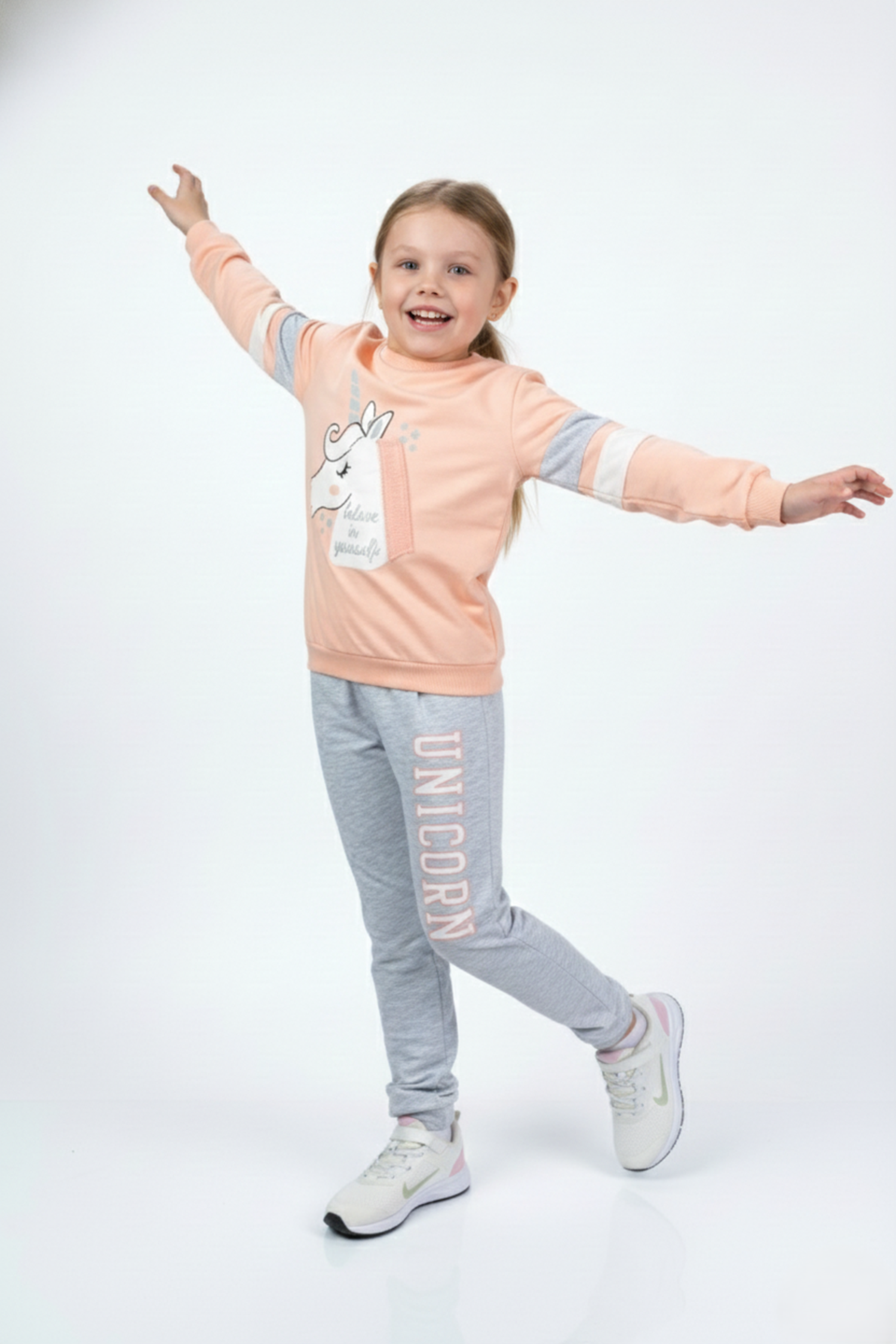 Kız çocuklarının enerjisine ve renkli dünyasına eşlik eden bu Unicorn baskılı eşofman takımı; yumuşak dokusu, rahat kalıbı ve sevimli tasarımıyla günlük kullanım için mükemmel bir tercih sunar.
