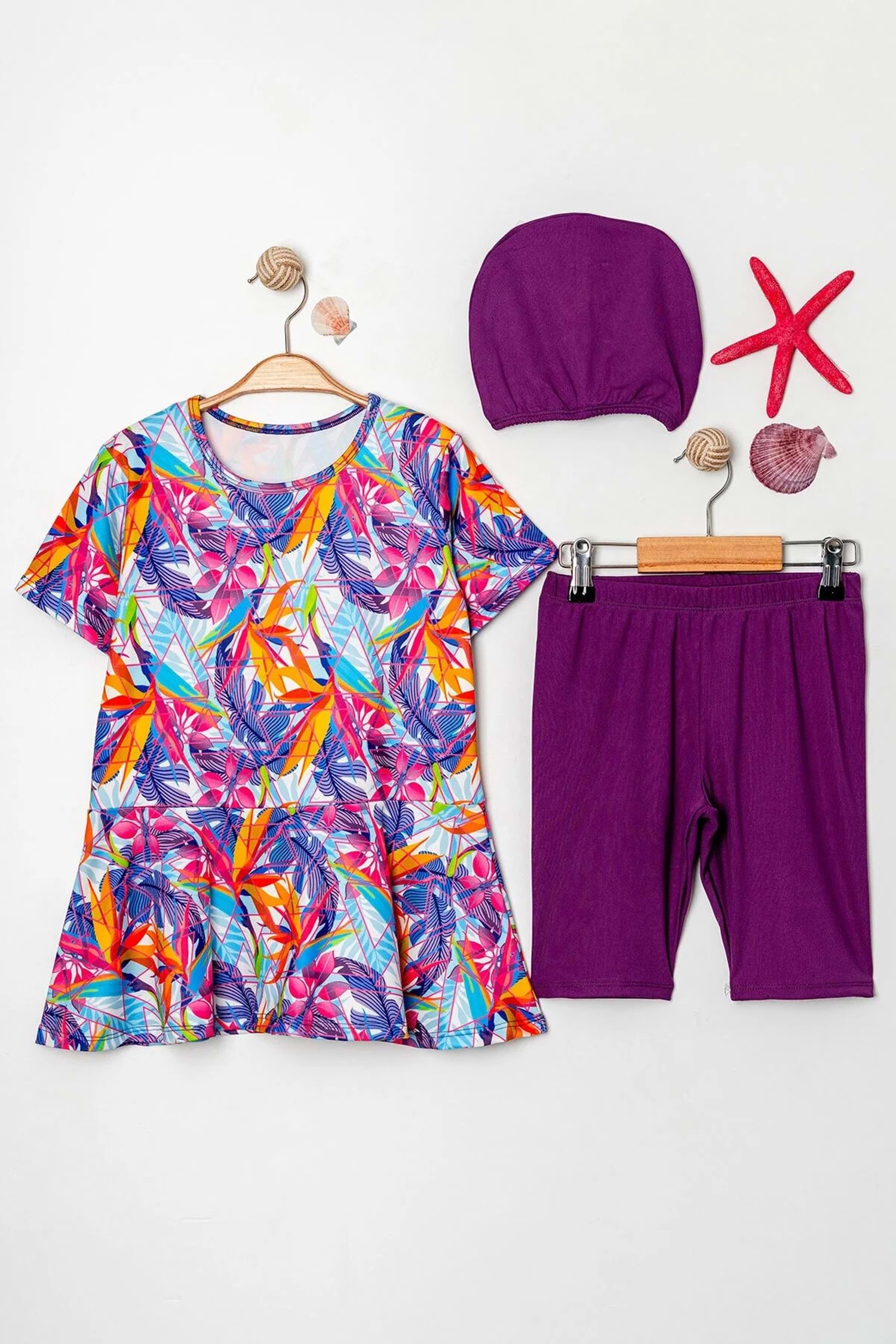 Kız Çocuk Desenli Mayo Takımı - Bone ve Şort Dahil Üçlü Deniz ve Havuz Mayosu M00814