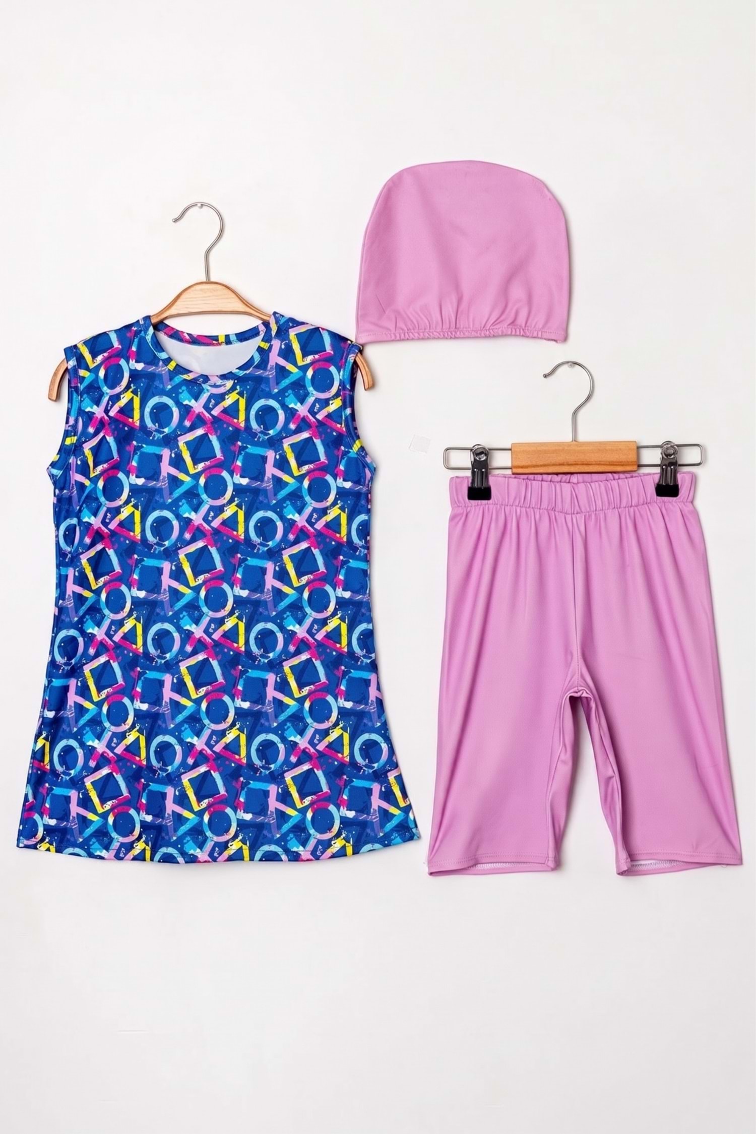 Kız Çocuk Desenli Mayo Takımı - Bone ve Şort Dahil Üçlü Deniz ve Havuz Mayosu M00814