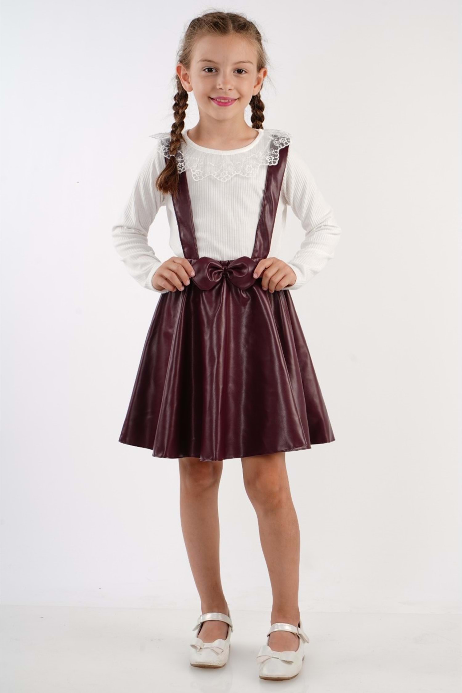 Deri etekli badi yakasında güpür ile modellenmiş 2 parçadan oluşan kız çocuk elbise.