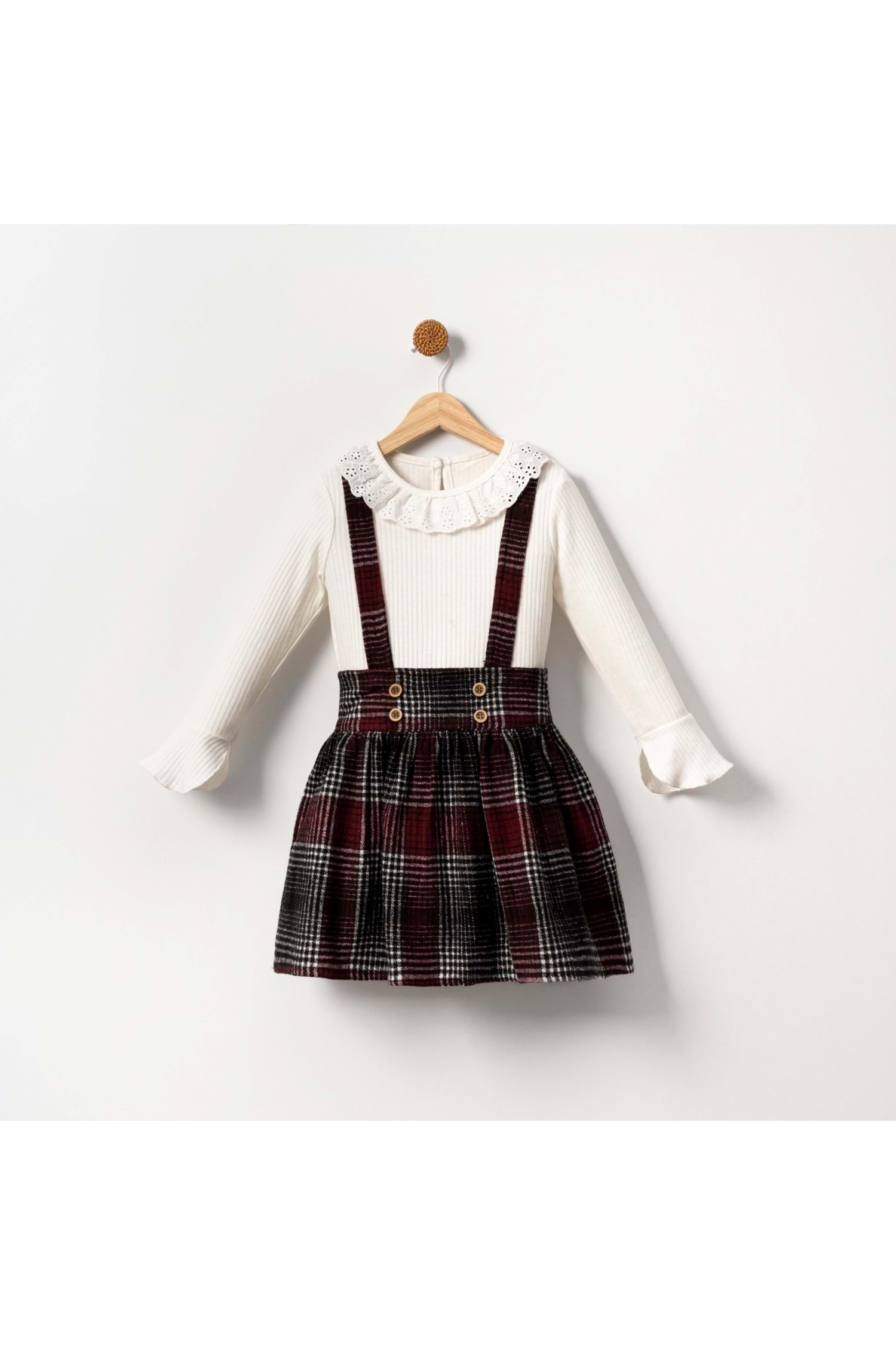 Salopet Askılı Ekose Kumaş İle Modellenmiş Elbise Ve İçimde Fittilli Kumaştan üretilmiş Fisto Yakalı Badisi İle Birlikte İki Parçadan Oluşan Kız Çocuk Takım