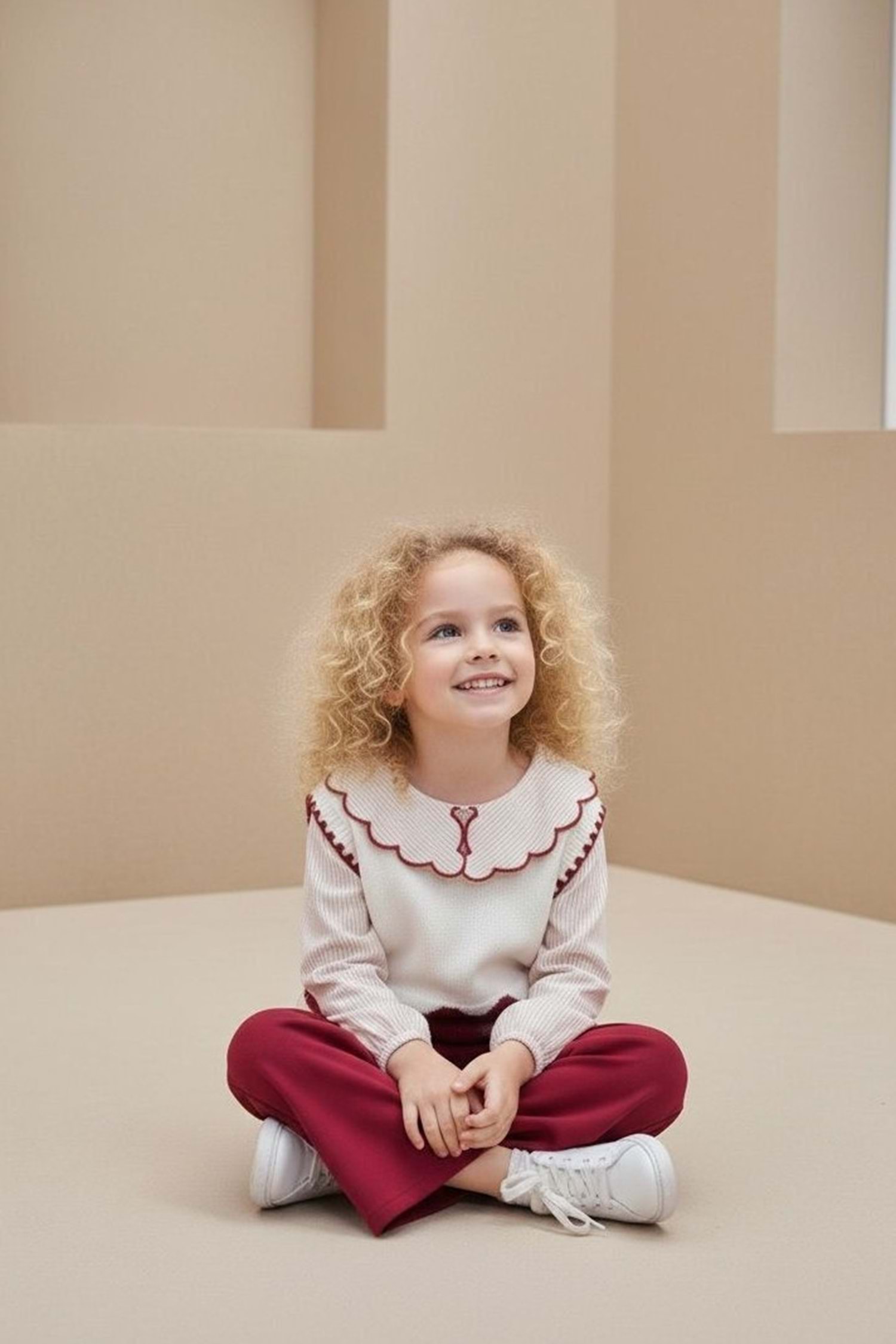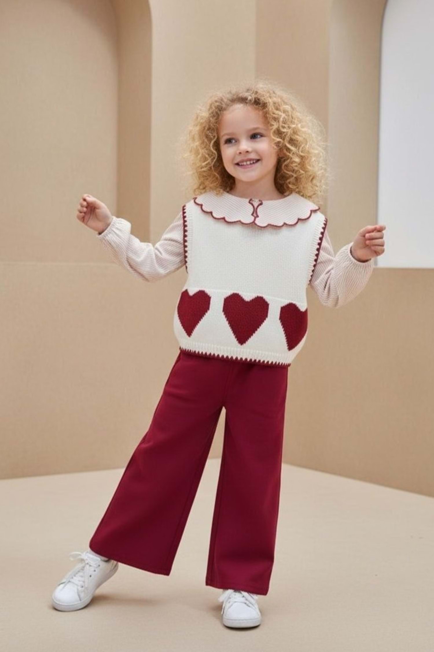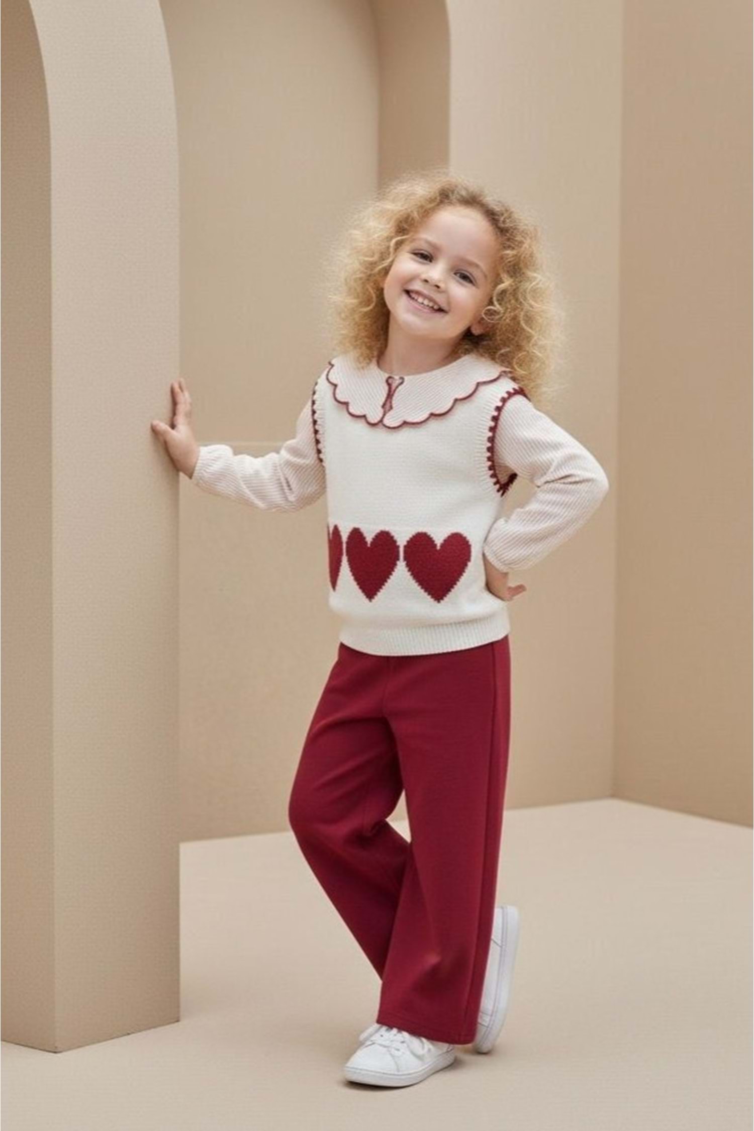 Şıklıkla rahatlığı aynı anda isteyenler için tasarlanan bu kız çocuk takım modeli; kalpli desenli triko süeter, gömlek yaka detaylı üst görünüm ve esnek pamuklu pantolon ile günlük kullanımdan özel günlere kadar geniş bir kullanım alanı sunar.