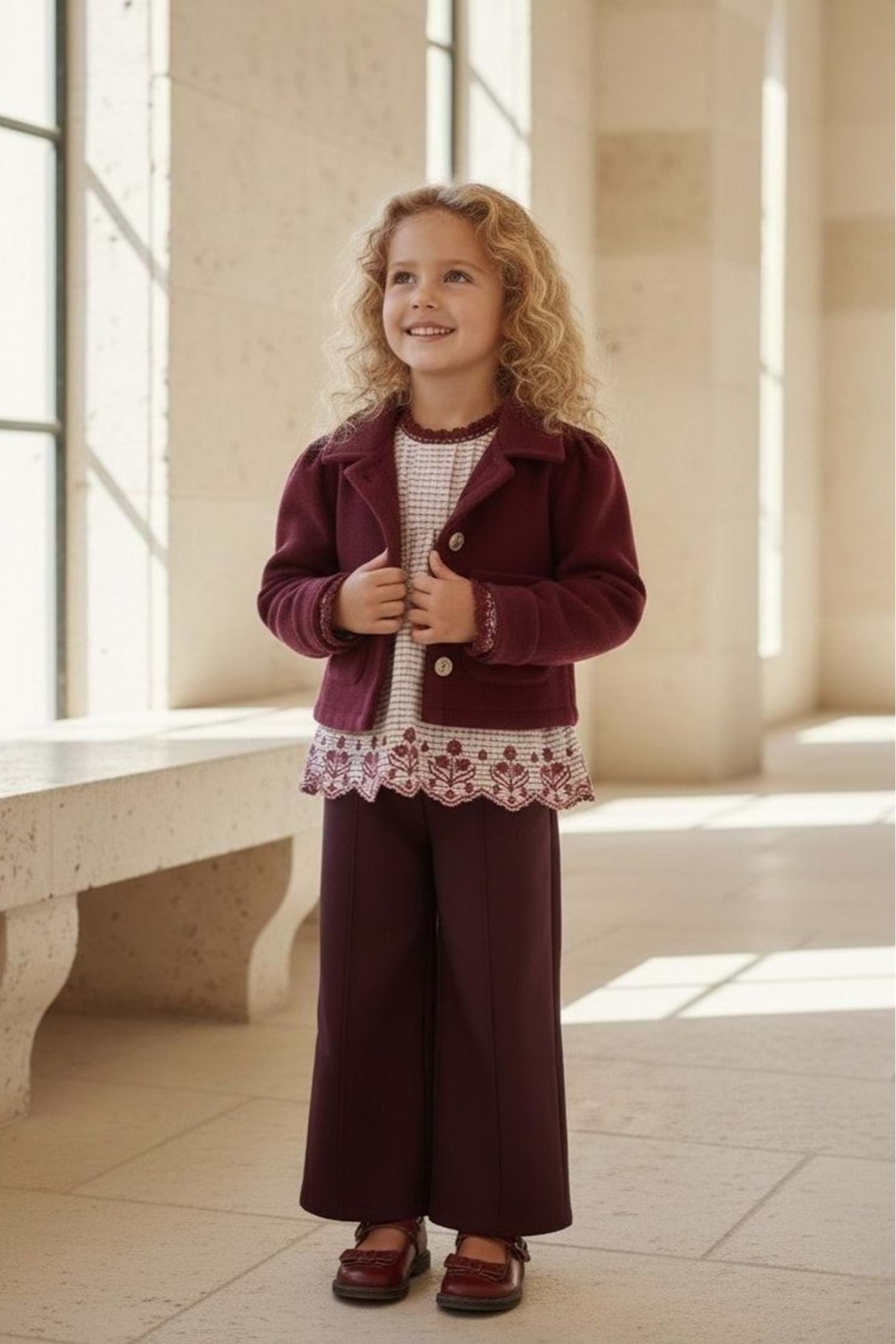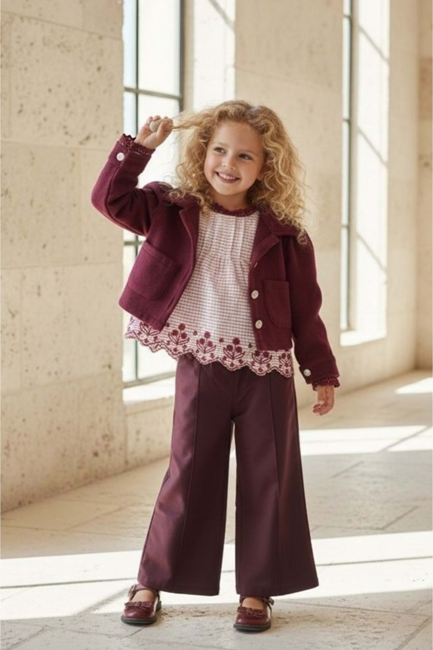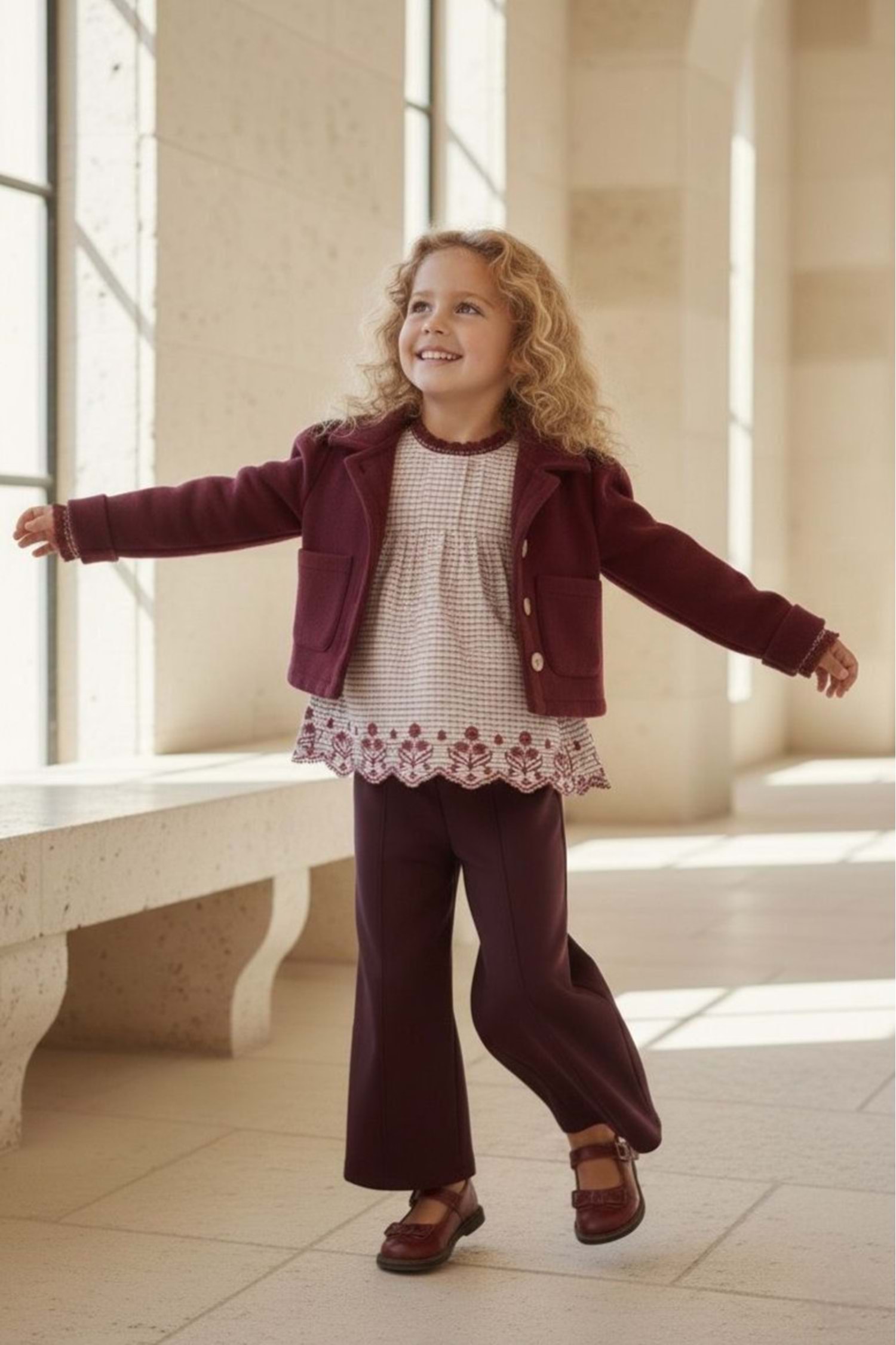 Zamansız şıklık arayanlar için tasarlanan bu kız çocuk takım modeli; bordo kaşe ceket, nakış detaylı krem gömlek ve ispanyol paça pantolon kombininden oluşur. Rahat kalıbı sayesinde çocukların hareket özgürlüğünü kısıtlamaz, görünümü ise fazlasıyla iddialıdır.